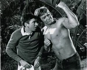Meanwhile, Gilligan carries the news to the Howells who mistakenly think a regal Duke has arrived and dispatch the flustered first mate to invite him for cocktails. Down at the beach, Duke fascinates the swimsuit clad girls with his stories and physique, and when Gilligan runs up, he smashes into Duke and collapses on the ground. Duke lifts him up and smugly flexes his bicep inches from Gilligan, who decides to build his own barbells and develop his body.