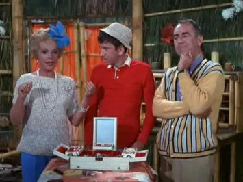 Gilligan brought with him to the island several things he probably kept on the S.S. Minnow, including comic books (Fossil Face, Davie Davis, Buck Rogers...), his diary, a lucky four-leaf clover lucky charm, a pocket knife, baseball cards, a deck of cards, his library card, a two-year-old Argentinian lottery ticket (#G131131), his bank book, a calendar, two marbles, seven cents, a secret compartment spy ring, a platinum yo-yo, Yogi Bear bottle tops, wheels from an old skateboard, a Manny Moose wristwatch, a boy scout handbook and his high school graduation ring from Girl's High. (Some mothers keep their kids in curls way too long.) He tries leaving some of his stuff to the others in Hair Today, Gone Tomorrow, but he's mostly just leaving everything around the island. He also finds four pearls and an onyx the Skipper believes is a wish-granting Eye of the Idol.