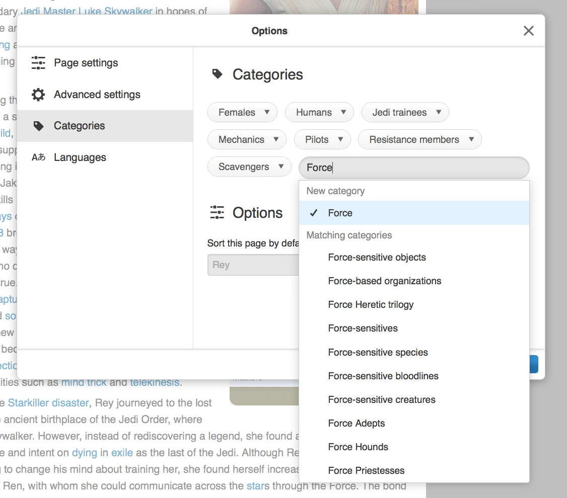 - When clicking the edit icon next to category names, you can define a "sortkey" for that category. This sortkey defines at what point the article appears in a category page's listings, e.g., sort a first last name page under last name.