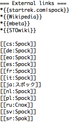 A typical ILL list, seen here in source mode at the bottom of the page, after the final section of the article Spock.