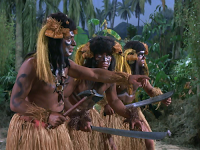 Because of the possible limited number of islands in the region, it is very likely several of the natives encountered by the Castaways came from common islands. Some of these islands were populated by hostiles against foreign invaders and potential enemies. Others collected the heads of foreign enemies ("head-hunters") out of religious belief. One of the first tribes the castaways encountered were a race of cannibals who (allegedly) heard their musical overtures and believed it to be a prelude to an attack. Invading the island, they forced the castaways into a cave, but due to their primitive nature, they were momentarily pushed back three times by their unfamiliarity with radios, flashlights and fire extinguishers. The Professor, Skipper and Mr. Howell were captured each time, but the Professor must have broken the language barrier because the two "tribes" separated on friendly terms. Episode: Music Hath Charms