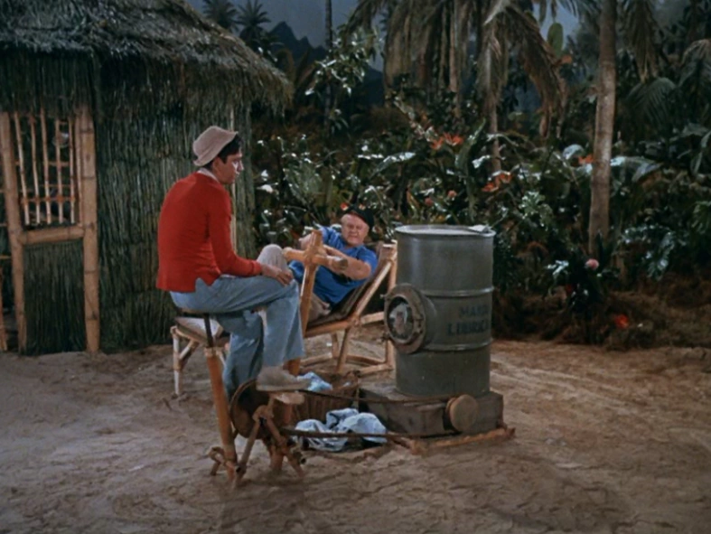 The Pedal-Powered Washing Machine is a creation of the Castaways that handled washing their laundry. In several episodes, it's implied that Mary Ann and Ginger do the laundry as they're often hanging clothes. The Skipper also grouses over it in Gilligan's Living Doll while Gilligan is actually doing it and later losing his hair literally in Hair Today, Gone Tomorrow.