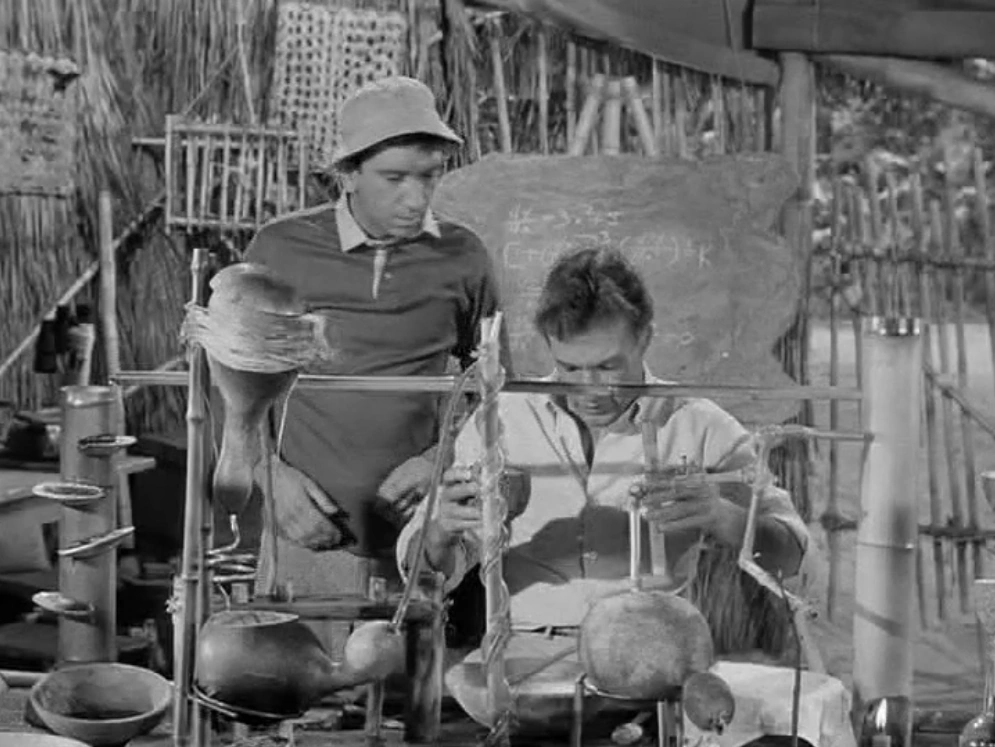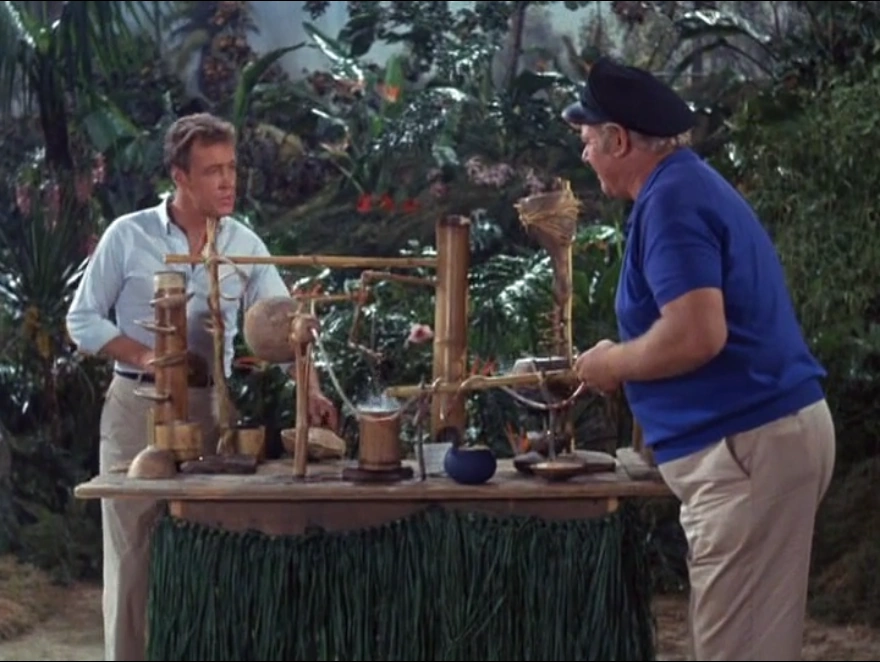 The Professor's Lab is a primitive make-shift scientific experiment set created from materials on the island by the Professor to conduct experiments and create medicine for the Castaways (mostly Gilligan) or create substances that might speed up their rescue. Among the potions, serums and concoctions he created was a replicant of Mrs. Howell's perfume, phosphorescent dye, a knock-out drink, a food preservative, nitroglycerine to blow up the volcano, an antidote against the bite of the Mantis Khani, anti-vampire potion (possibly just the knock-out drops again), keptaburra berry extract and synthetic jet fuel for the XJP Jet Pack. His ingredients often involve calcium carbonate from clam shells, cellulose sulfide from mustard plants, ferric nitrate from papaya root, sodium nitrate, sulfuric acid from crystalized copper in the caves, glycerol from papaya seeds, potassium nitrate from the rocks in the lagoon and other ingredients from the wild plants and resorces on the island. It also pops up in casual scenes such as when the Skipper checks to see if the Professor was invited to the Howell's cotillion.