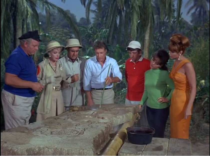 | Gilligan bumps his head and starts seeing everything upside down. When he drinks the Professors "cure," he sees two of everything, then five of everything. Meanwhile, headhunters are capturing everyone else. | ||||