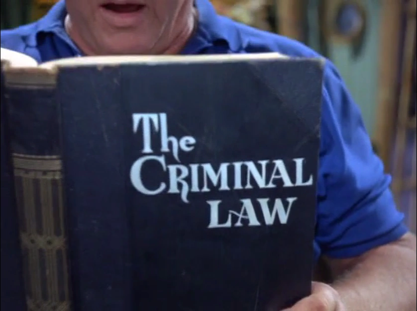 The Criminal Law is a criminal law text book containing municipal and criminal codes. It's not known how it turns up on the island, but it maybe just one of several books left on the S.S. Minnow. After Gilligan witnesses a staged murder, the Skipper and Professor see a need for a way to police the island. The Skipper becomes "sheriff," and Gilligan becomes deputy, but in his absence, Gilligan takes the laws of the book too seriously and ends up locking everyone in "jail," a cave with bamboo bars (possibly left over from Forget Me Not and The Hunter), including the Skipper who manhandles Gilligan to get the key back. Eventually, everyone gets out on "good behavior," but not until the Skipper gives Gilligan a taste of his own medicine. The list of "crimes" by the Castaways: