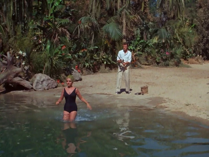The lagoon was also a source of food for the castaways on the island, for they caught fish, as well as lobsters in the lagoon. It is also the scene where several objects wash in from the sea such as a military attaché case, a crate of radioactive vegetables, a box of plastic explosives and other objects. Visitors also tend to land here, such as Dr. Boris Balinkoff, Jackson Farrell, Duke Williams, Erika Tiffany Smith and a Japanese Sailor among others. The Professor once placed a stick in the lagoon with markers to keep track of the water level on the isle. Gilligan once put his lobster traps on that stick, and was placing it in deeper water to catch larger lobsters, which led the Professor and the others to believe the island was sinking. The Castaways have also dug up items here like a tiki statue, pirate chest and a rare gem that seemed to grant three wishes. The digging of a lobster trap, however, seemed to cause a section of the bank to float out into the lagoon.